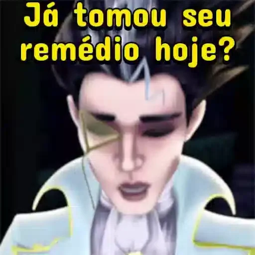 Personagem de anime com expressão séria e olho coberto, usando um colar branco com detalhes em amarelo. O texto 'Já tomou seu remédio hoje?' aparece em amarelo acima dele.