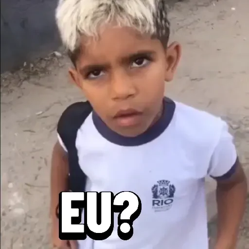 Menino com cabelo loiro encaracolado e expressão surpresa, vestindo uma camiseta branca com detalhes em azul. O texto 'EU?' aparece em destaque.