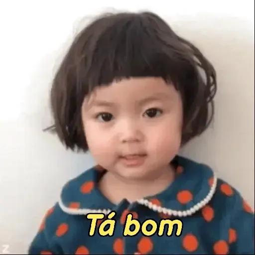 Menina com franja e cabelo castanho, vestindo uma blusa azul com manchas vermelhas. A legenda 'Tá bom' aparece em amarelo na parte inferior.
