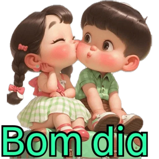 Um menino e uma menina se beijando no rosto, com a menina de olhos fechados e bochechas rosadas. Abaixo deles, está escrito 'Bom dia' em letras grandes e verdes.