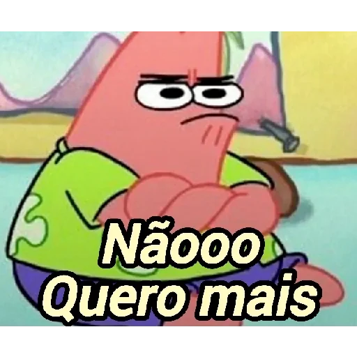 Patrick Star com expressão de descontentamento, braços cruzados e texto 'Nãooo Quero mais' sobreposto.