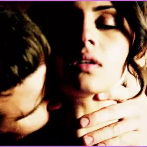 Um homem beijando o pescoço de uma mulher com os olhos fechados, ambos com expressões de intimidade.