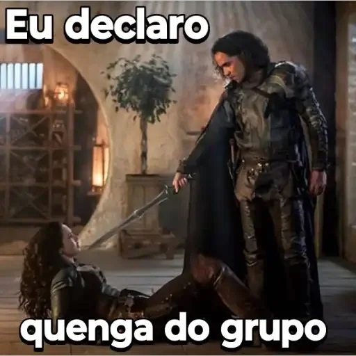 Cena de uma série com um homem de armadura e capa preta ao lado de uma mulher caída no chão, com a frase "Eu declaro quenga do grupo" sobreposta.