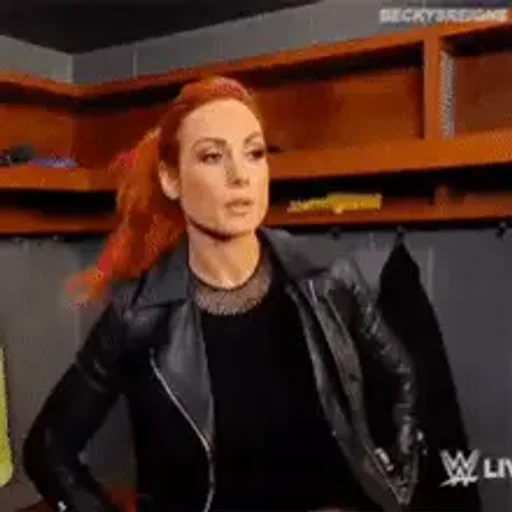 Mulher ruiva com jaqueta preta em um ringue de luta livre, com um público ao fundo.