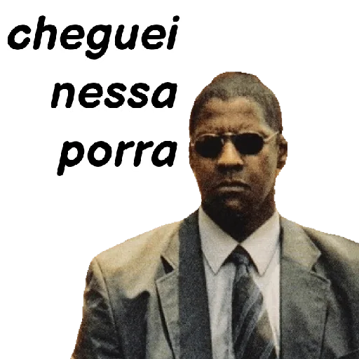 Um homem de terno e óculos de sol com a frase 'cheguei nessa porra' ao lado esquerdo.