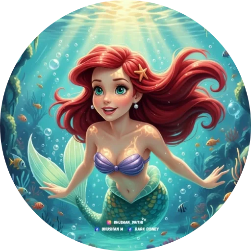 Uma ilustração da Ariel, a princesa sereia do filme Pequenos Peixes, com cabelos vermelhos longos e cauda de peixe, cercada por peixes coloridos e luzes de sol filtrando a água.