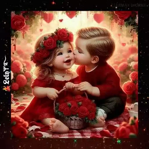 Um menino e uma menina se beijando, sentados em um tapete vermelho com rosas. A menina usa um vestido vermelho e uma coroa de rosas, enquanto o menino veste uma camisa vermelha. Eles seguram uma cesta de rosas vermelhas.