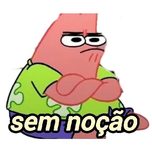 Personagem Patrick Star de Bob Esponja com expressão confusa e braços cruzados, vestindo uma camisa verde e calça roxa, com o texto 'sem noção' em destaque.