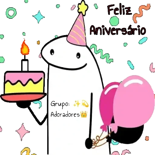 Um desenho de um personagem com um chapéu de aniversário segurando um bolo com uma vela, ao lado de balões cor-de-rosa. O texto 'Feliz Aniversário' e 'Grupo: Adoradores' aparece na imagem.