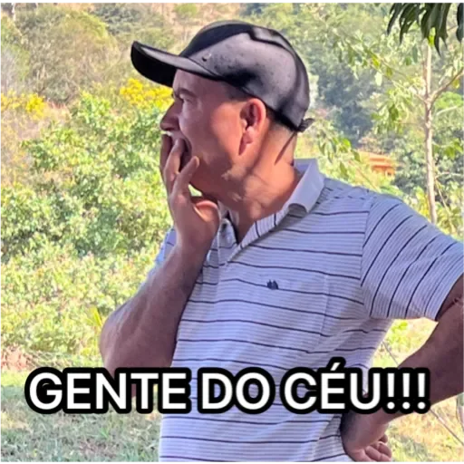 Homem de meia-idade com camisa listrada e boné conversando ao telefone ao ar livre, com expressão de surpresa ou espanto. A imagem traz o texto 'GENTE DO CÉU!!!'