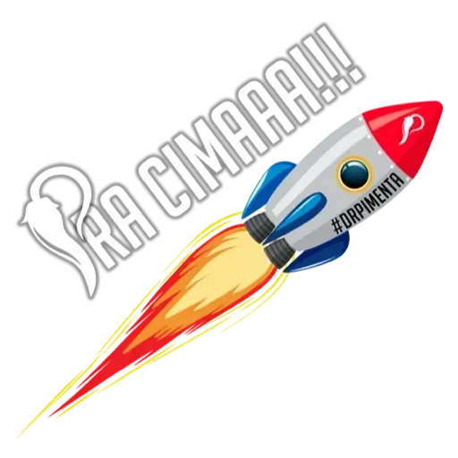 Foguete prateado com bico vermelho e chamas laranjas, texto 'PRA CIMAAA!!!' e um coração.