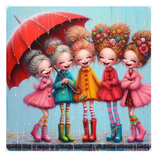 Quatro meninas fofas com penteados coloridos e roupas combinando, duas com guarda-chuva vermelho, em um fundo azul com chuva. As meninas têm expressões felizes e estão vestidas com cores vibrantes.