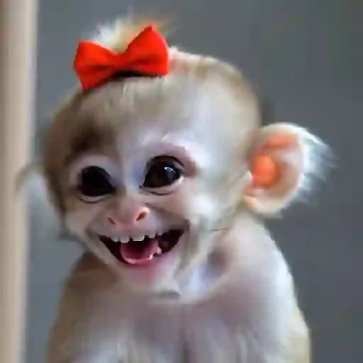 Macaco com laço vermelho no cabelo e expressão engraçada, mostrando os dentes.