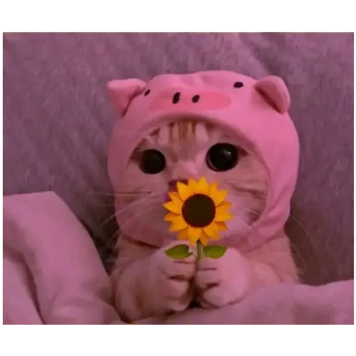 Gato fofinho vestido com uma roupa de porco rosa, segurando um girassol.
