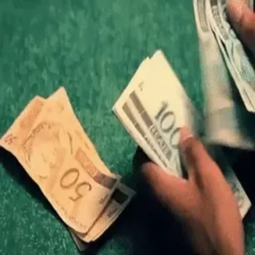 Mão segurando uma nota de 100 dólares ao lado de uma nota de 50 dólares amassada sobre uma superfície verde.