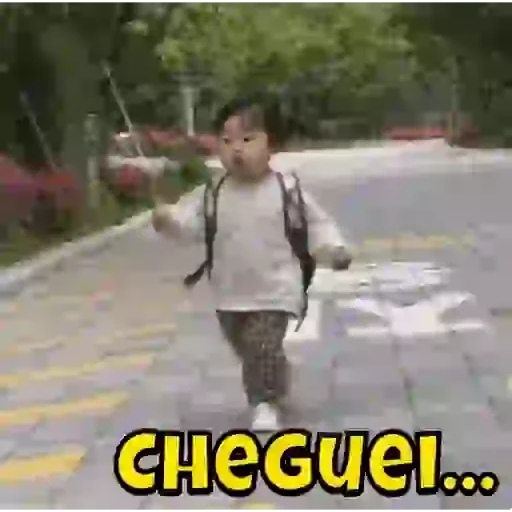 Menino pequeno com mochila, parecendo caminhar em uma rua, com o texto 'CHEGUEI...' em amarelo na parte inferior.