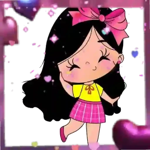 Menina de cabelo preto com laço rosa, sorriso e olhos fechados, vestindo uma blusa amarela e saia rosa, rodeada de corações e confetes.