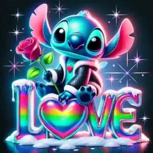 Stitch, personagem de Lilo & Stitch, com uma rosa vermelha e um coração arco-íris, com o texto 'LOVE' colorido.