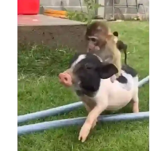 Um leitão preto e branco com um macaco marrom montado em suas costas, correndo em um gramado com tubos azuis no chão.
