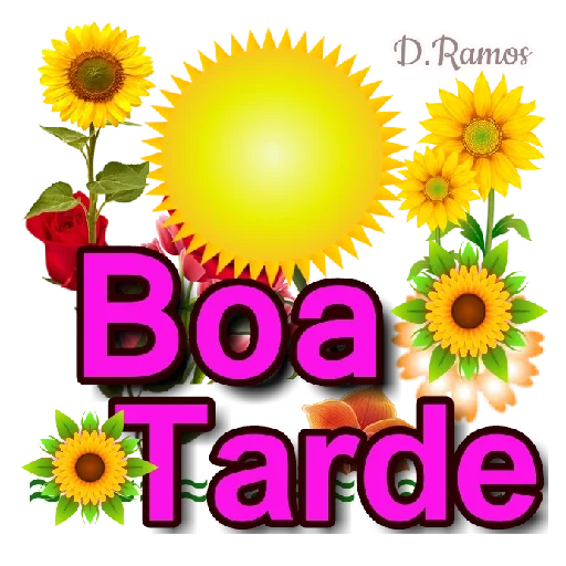 Um sol amarelo brilhante e girassóis coloridos com a frase 'Boa Tarde' em letras grandes e rosadas.