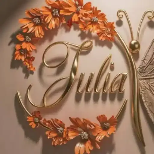 Um nome 'Julia' em letras douradas cursivas, cercado por flores laranjas e folhas, com uma asa de borboleta à direita.