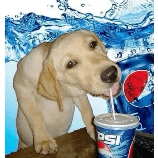 Um cachorro amarelo bebe de um copo de refrigerante com um canudo, com água respingando ao fundo.