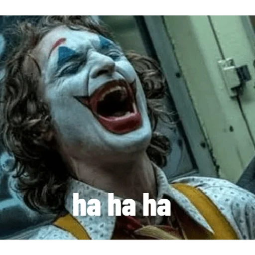 O Coringa ri alto com a boca aberta e olhos pintados, usando um terno amarelo e camisa branca com pontos. 'ha ha ha' está escrito embaixo.