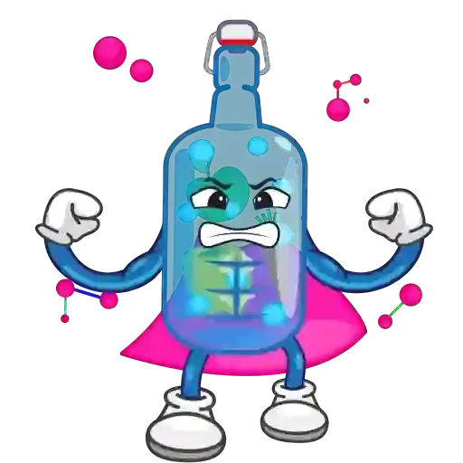 Um desenho de uma garrafa de água com expressão de dor de estômago, usando uma capa rosa e com moléculas ao redor.