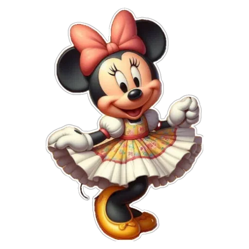 Minnnie Mouse usando um vestido branco e laranja com um laço rosa no cabelo