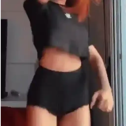 Uma mulher jovem com cabelo laranja e uma blusa preta está dançando em frente a uma porta.
