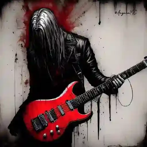 Um homem com cabelos longos e pretos veste uma jaqueta de couro e segura um violão elétrico vermelho. O fundo é cinza com manchas de tinta vermelha e preta.