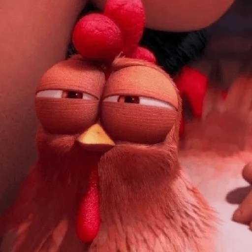 Um galo de desenho animado com expressão séria e olhos estreitos, penas avermelhadas e crista vermelha.