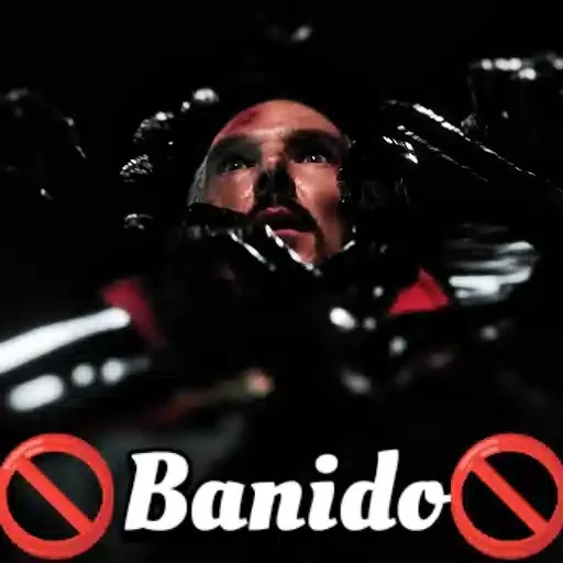Um homem com expressão de surpresa ou choque, usando um headset, com as palavras 'Banido' e dois símbolos de proibição vermelhos.