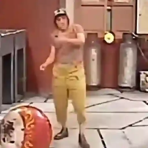 Homem com camisa marrom e calça amarela dançando com os braços cruzados em frente a uma parede vermelha e cilindros de gás.