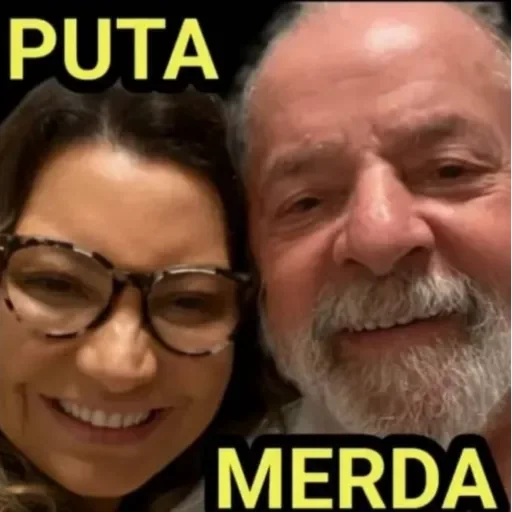 Um casal sorrindo com as palavras 'PUTA' e 'MERDA' em letras amarelas