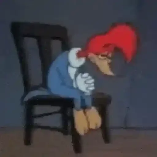 Personagem de desenho animado, Woody Woodpecker, sentado em uma cadeira com expressão de tristeza ou desapontamento. Ele tem penas vermelhas na cabeça, bico grande e está vestindo uma camisa azul com gola branca.
