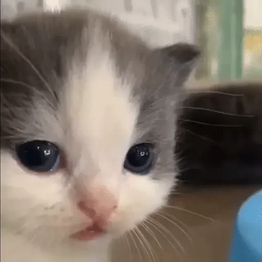 Rosto de um gatinho cinza e branco com olhos pretos grandes e focados na câmera, mostrando uma expressão curiosa ou surpresa.