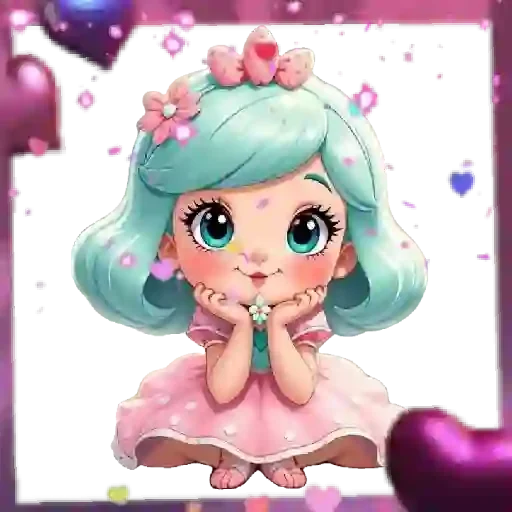 Uma menina de olhos azuis e cabelo verde, vestida de rosa, com flores na cabeça e joias, cercada de corações e confetes.