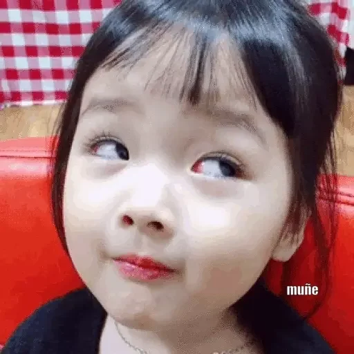 Menina com expressão surpresa, olhar para cima, cabelo preto com franja, fundo vermelho xadrez.
