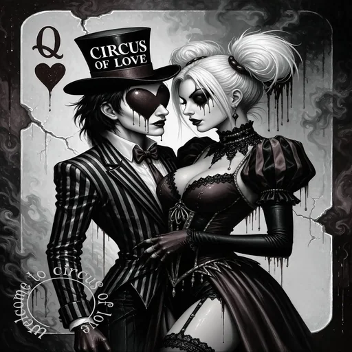 Um casal de personagens com máscaras de palhaço se abraçando em um cartão de jogo de cartas com tema de circo. O homem usa um chapéu de palhaço e um terno listrado, enquanto a mulher usa um vestido preto.