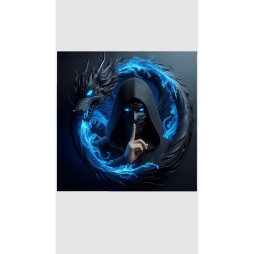 Um homem com uma capa preta e um dragão azul ao fundo, com chamas azuis ao redor.