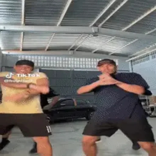 Duas pessoas dançando em uma garagem, com roupas casuais e fazendo um gesto com as mãos.