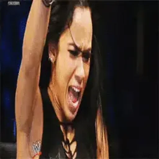 Mulher com cabelo preto e maquiagem pesada em um evento lotado, possivelmente um ringue de luta livre, com o texto…