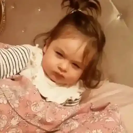 Bebê com expressão séria, vestida com uma blusa listrada e uma saia rosa com flores brancas, com o cabelo castanho preso em um coque.