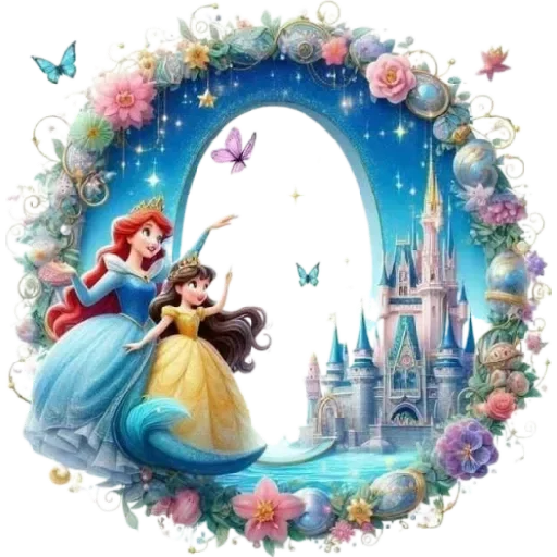 Duas princesas Disney, uma de cabelo ruivo com vestido azul e outra de cabelo castanho com vestido amarelo, estão diante de um castelo com uma moldura de flores e borboletas.