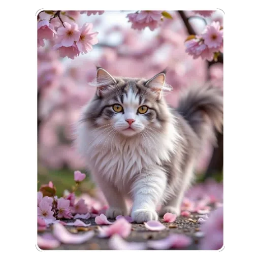 Gato cinza e branco com olhos castanhos, focinho rosa, em meio a pétalas de flores cor-de-rosa. O gato parece estar caminhando em direção ao observador.