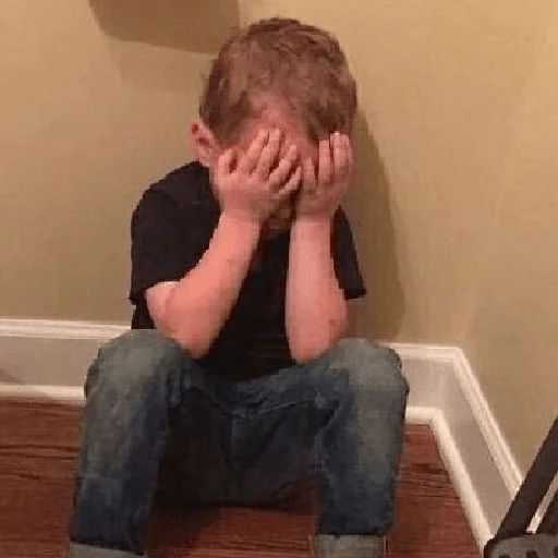 Menino sentado em um canto, cobrindo o rosto com as mãos, parecendo envergonhado ou arrependido.