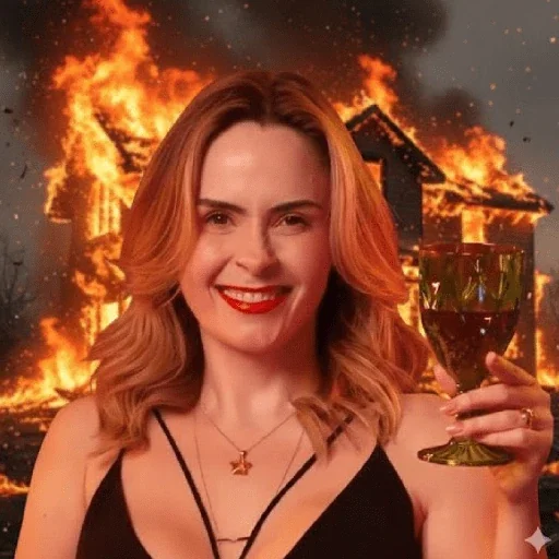 Uma mulher loira sorri enquanto segura um copo de vinho diante de uma casa em chamas ao fundo.
