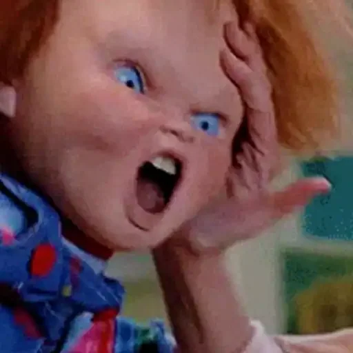 Um boneco de criança com olhos azuis arregalados e cabelo ruivo, com a mão na face e boca aberta em choque ou surpresa.