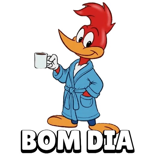Um pássaro cartoon de penas vermelhas e bico laranja, usando um roupão azul, segura uma xícara de café e deseja 'BOM DIA'.